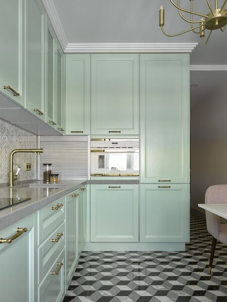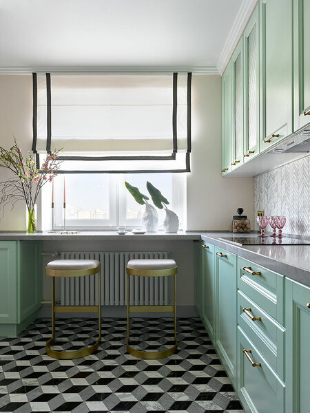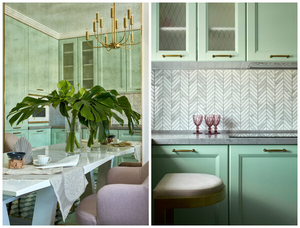 На кухне преобладает зелёный цвет, но более нежного, мятного оттенка. Яркий гарнитур буквально опоясывает всю комнату. Розовый, напротив, использовали в качестве акцента для обивки кресел.