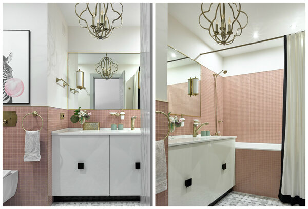 Раздельный санузел объединили, чтобы выиграть полезную площадь. Здесь преобладает розовый цвет – стены до середины оформили мозаикой. Стилистики ар-деко добились при помощи латунных светильников и фурнитуры, шторы с тёмной окантовкой. А за ироничным постером с зеброй скрывается лючок доступа к инсталляции унитаза.