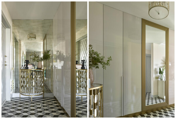 Такое же зеркало появилось и на стене в прихожей. Эффект усилили при помощи консоли из латуни с зеркальными вставками. Здесь тоже можно разглядеть дверцы встроенного шкафа. А там, где дверцы обращены в сторону спальни, установили ещё одно зеркало, на сей раз в раме.