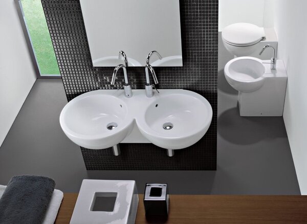 Hatria you and me. Ну что тут сказать? Обожаем! Во-первых, это самый компактный унитаз. Во-вторых, есть угловой. И это вообще чуть ли не единственный угловой унитаз с «кнопкой в стене». Подразумевается, что с ним используют бачок скрытого монтажа, но инсталляцию тоже можно, только осторожно =)) Warning!!! унитаз ПРИСТАВНОЙ, то есть в случае с инсталляцией не забудьте, что ее ставят часто ДО плитки, а унитаз ПОСЛЕ и высоты могут не подружиться :’(. Еще один минус углового унитаза hatria you and me — он бывает только одной ориентации. Зеркального отражения нет! В-третьих, это опять же сверхкомпактная двойная раковина. Кому? Зачем? А детям! У вас много детей, одновременно собирающихся в сад/школу и дерущихся за место под краном? Тогда это может вас спасти =))