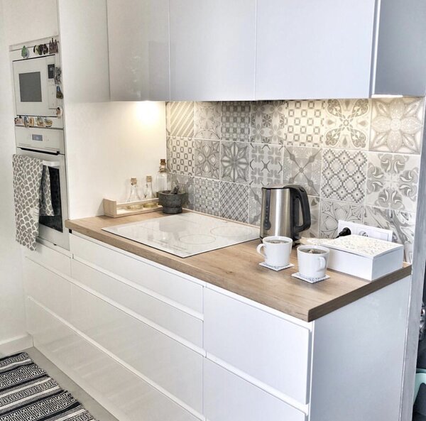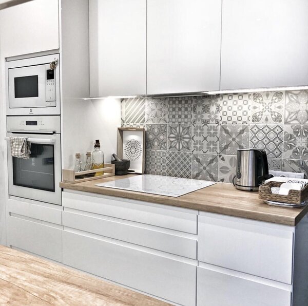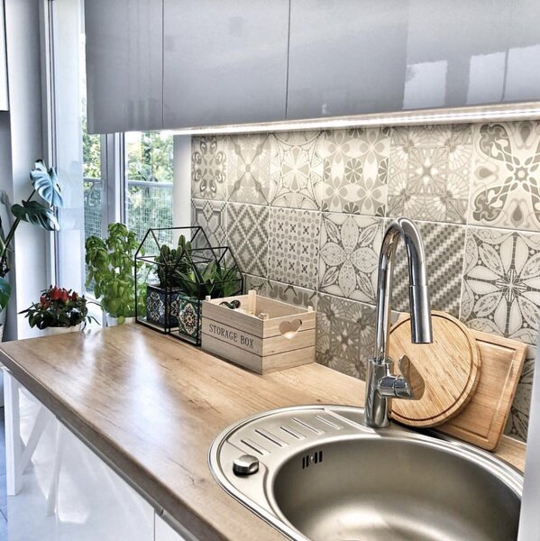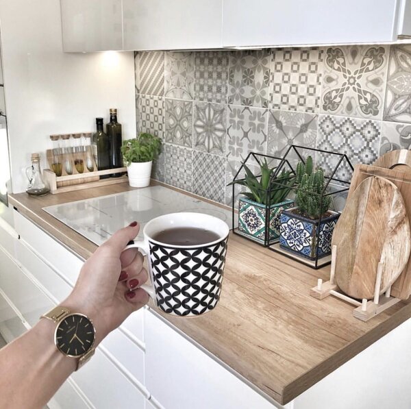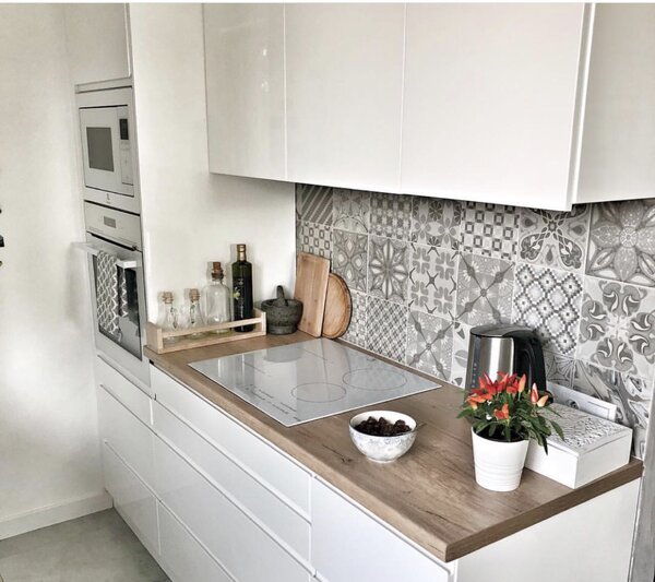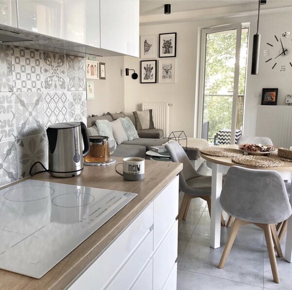 ☑️ Напольное покрытие перекликается по тону с кухонным фартуком, создавая спокойный фон.