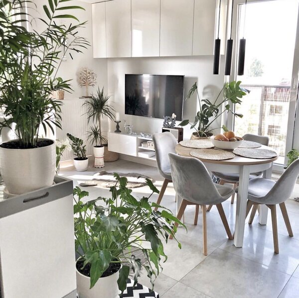 Обилие комнатных растений — ключевой прием, который оживляет монохромную бело-серую палитру. Зелень добавляет красок, свежести и не позволяет интерьеру казаться стерильным или скучным.