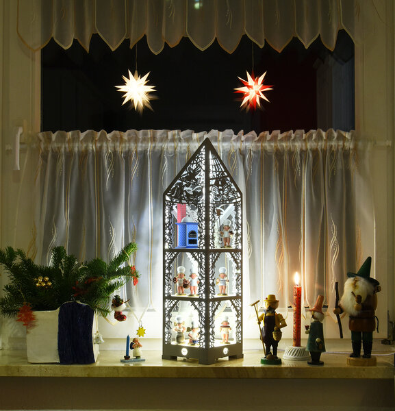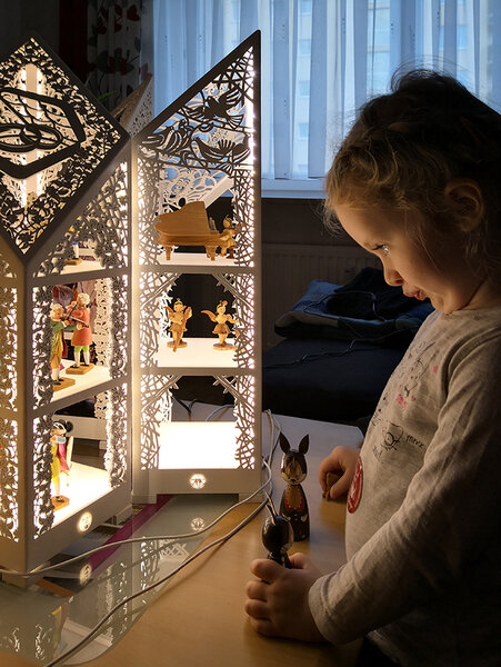 Маттиас дополнил коллекцию традиционного рождественского декора любопытной разработкой: башенкой-светильником со скошенной кровлей. Уникальность изделия в том, что башенки можно собирать, дополнять и комплектовать между собой, наполняя внутренне содержание различными мотивами: вот рождественский вертеп с яслями и фигурками Девы Марии и Младенца Иисуса; вот пастухи с ягнёнком, вол и осёл из Евангельской истории; а вот и бал эпохи барокко, дамы в пышных платьях и лакеи в париках.
