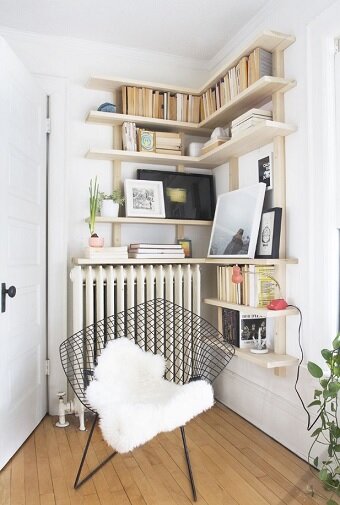 2. Уголок для чтения. У Вас осталось пустующее пространство за дверью Вашей комнаты в углу? Обыграйте его, создав стильный и уютный уголок для чтения. Потребуются несколько узких полочек, чтобы разместить любимые книги, настольная лампа и мягкий плед.