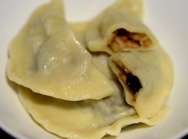 Летом можно со свежими плодами лепить, а зимой лепим с заморженными. Главное лепить сразу перед варкой, а то от вытекающего подтаивающего сока вареник может разойтись.