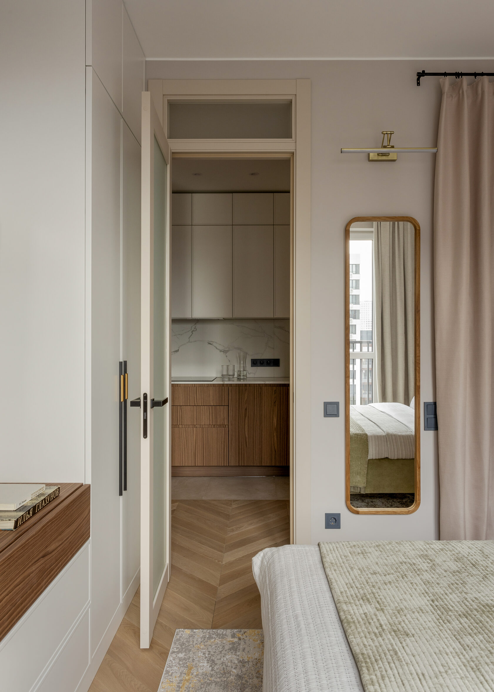 В результате получился продуманный интерьер, где эстетика природных материалов сочетается с практичными решениями для жизни большой семьи. Пространство кажется больше благодаря зеркалам и светлой палитре, а обилие систем хранения помогает поддерживать порядок.