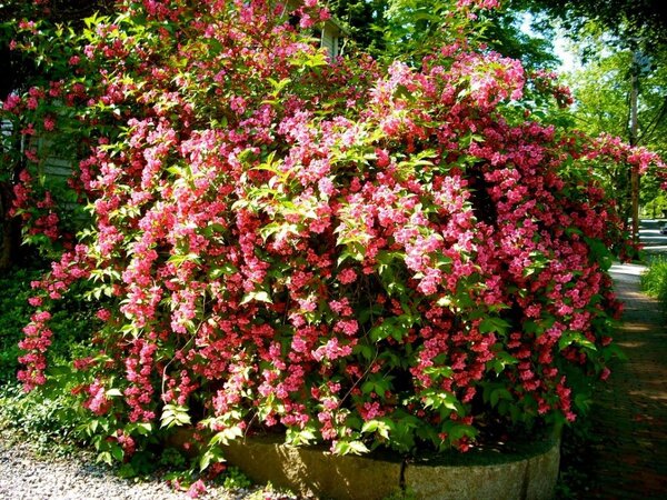 4. Вейгела гибридная — результат скрещивания корейской и обильноцветущей вейгелы. Её главная черта — невероятно обильное цветение, когда под массой крупных цветков практически не видно листвы.