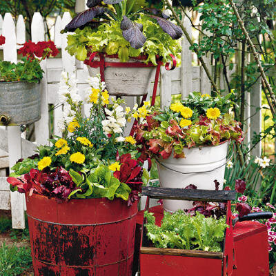 Необычные клумбы для цветов. Посадите в ведро яркие однолетники или вьющиеся растения — получится мобильная и очень эффектная цветочная композиция, которую можно перемещать по участку.
