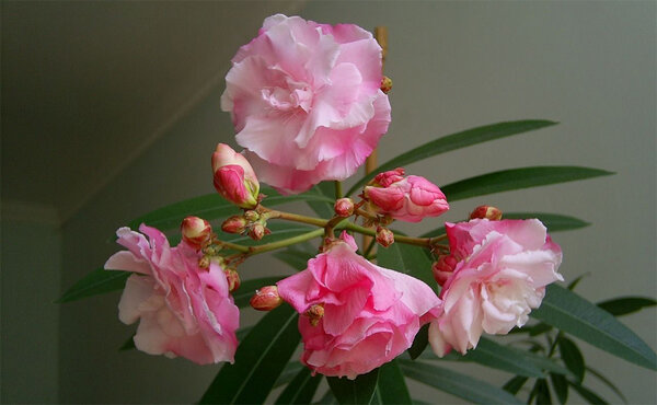 При недостатке света олеандр сразу сигнализирует об этом: его побеги становятся тонкими и длинными (вытягиваются), листья бледнеют, а уже сформированные бутоны могут опасть, так и не раскрывшись.